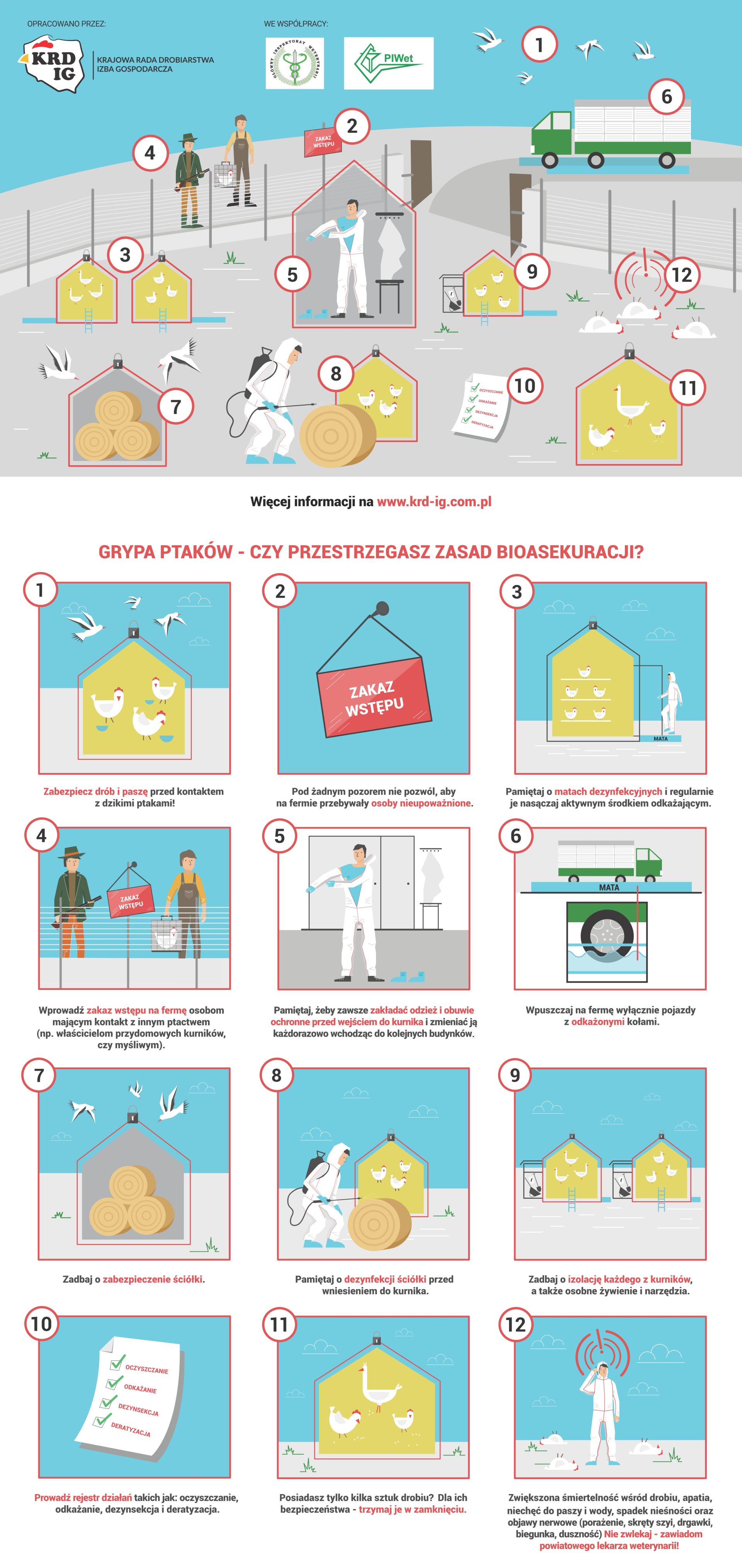 - szczelne przykrycie pojemników z karmą i wodą do picia lub przetrzymywanie ich wewnątrz budynków, a także unikanie pojenia ptaków i czyszczenia pomieszczeń wodą pochodzącą spoza gospodarstwa (głównie ze zbiorników wodnych i rzek);