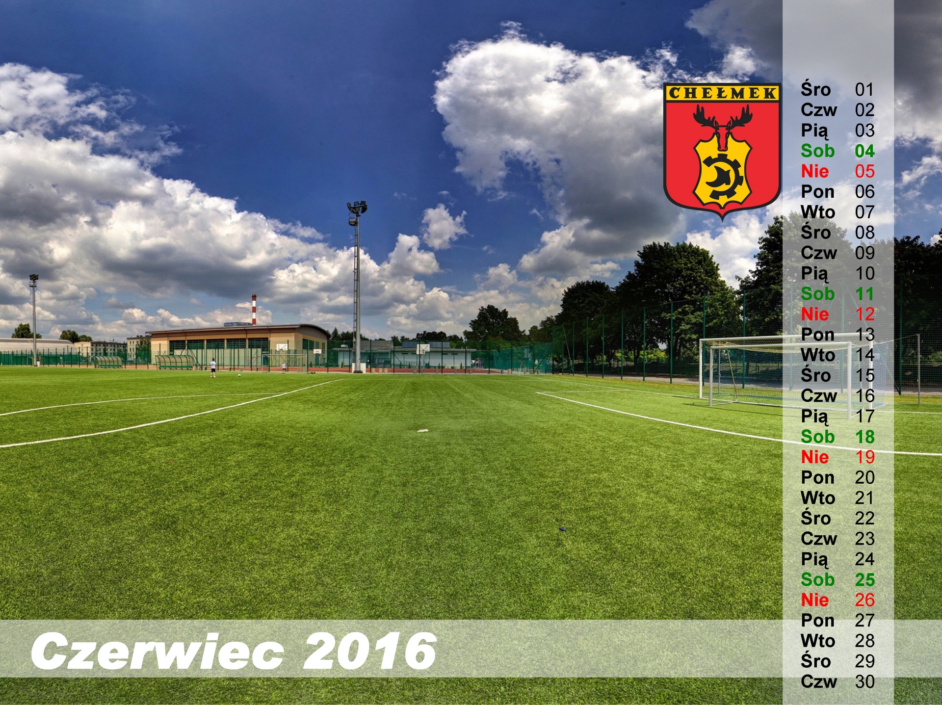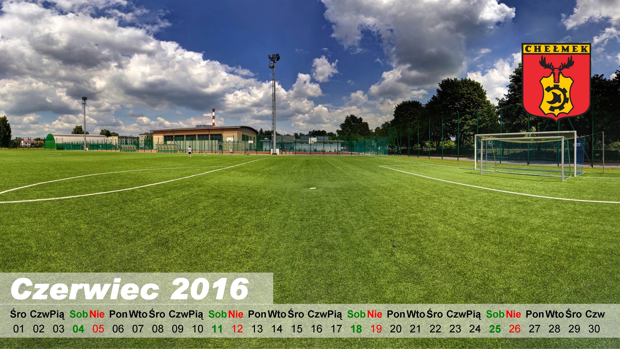 Przygotowaliśmy kolejne zdjęcie z kalendarzem, które można pobrać i ustawić jako tapetę pulpitu na komputerze. Poniżej dostępne są cztery wersje w najpopularniejszych rozmiarach. Tym razem na czerwcowym kalendarzu znalazło się zdjęcie, przedstawiające boisko w Centrum Sportowym w Chełmku. Aby pobrać tapetę z kalendarzem wystarczy kliknąć w link z podaną rozdzielczością ekranu (dostępny poniżej), następnie kliknąć prawym przyciskiem myszy i wybrać polecenie "ustaw jako tapetę". Zachęcamy do pobierania.
